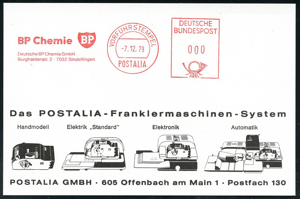 3891 | 15 € | POSTLEITRAUM 7000 (OHNE STUTTGART) : 7032 Sindelfingen 1979 (7.12.) AFS: VORFÜHRSTEMPEL/POSTALIA: BP Chemie BP/Deutsche BP.. (Firmenlogo) auf seltener Postalia-Muster-Kt. (= Specimen) | ![]() | |