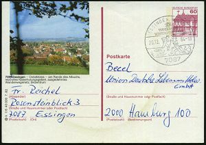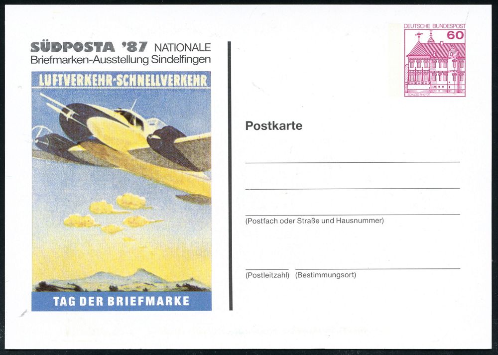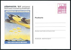 3896 | 10 € | POSTLEITRAUM 7000 (OHNE STUTTGART) : Sindelfingen 1987 PP 60 Pf. Burgen: SÜDPOSTA ´87.../TAG DER BRIEFMARKE (histor. Lufthansa-Plakat) ungebr. (Mi.PP 106) | ![]() | |