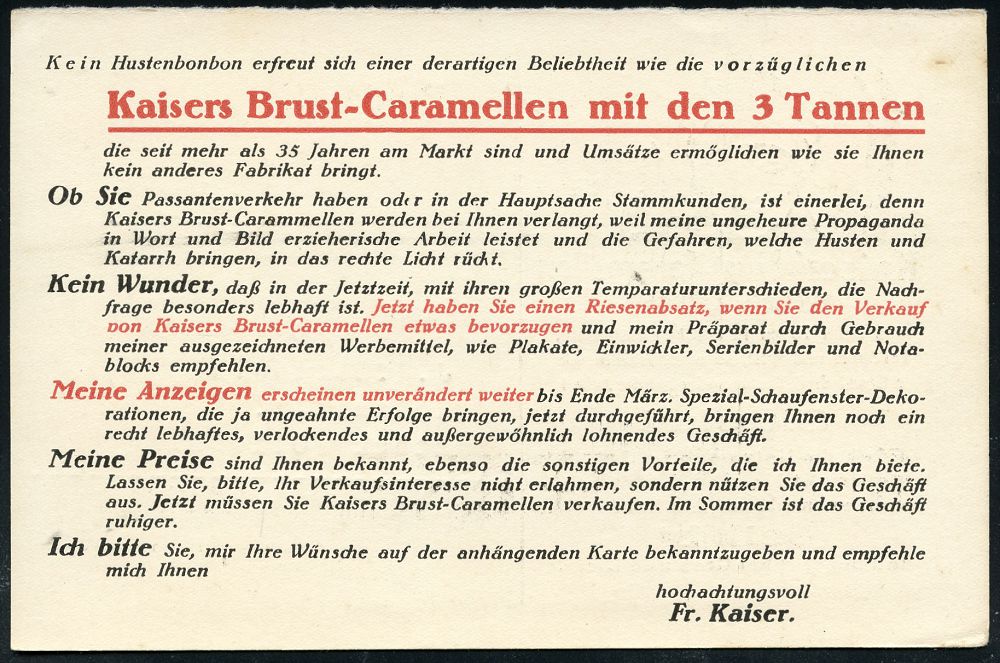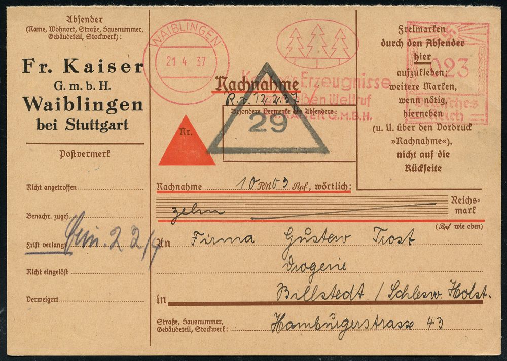 3914 | 18 € | POSTLEITRAUM 7000 (OHNE STUTTGART) : WAIBLINGEN/ Kaiser´s Erzeugnisse/ haben Weltruf.. 1937 (21.4.) AFS Francotyp "Hakenkreuz" 023 Pf. (Logo: 3 Tannen = Bonbon- u. Karamellen-Fabrik) Inl.-NN-Karte mit NN-Dreieckstempel "29" n. Billstedt, seltenes Porto! (Dü.E-3CEo) | ![]() | |