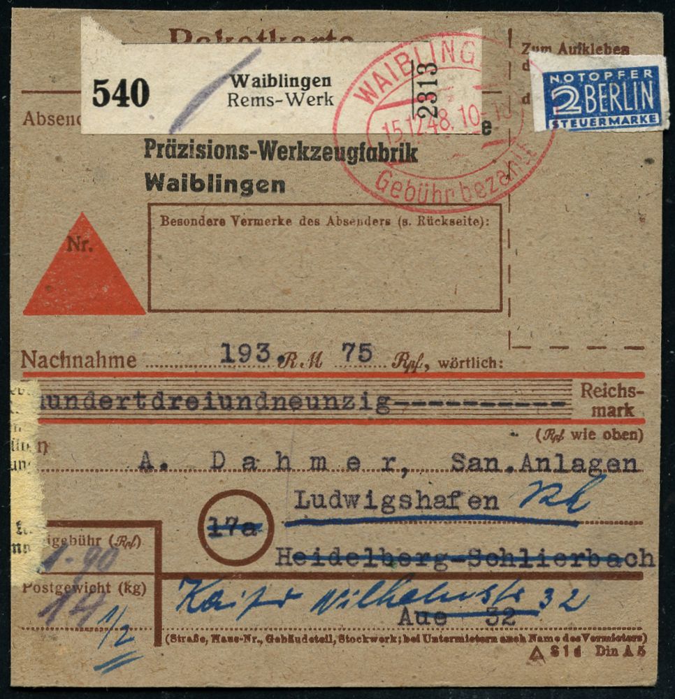 3917 | 16 € | POSTLEITRAUM 7000 (OHNE STUTTGART) : WAIBLINGEN/ Gebühr bezahlt 1948 (15.12.) roter Doppel-Oval-PFS auf 2 Pf. NoB (ungez.) + schw. Selbstbucher-Paketzettel: Waiblingen/ Rems-Werk, nachgesandte Inl.-NN-Selbstbucher-Paket-Kt. (Dü.A-5, Nr.20) | ![]() | |