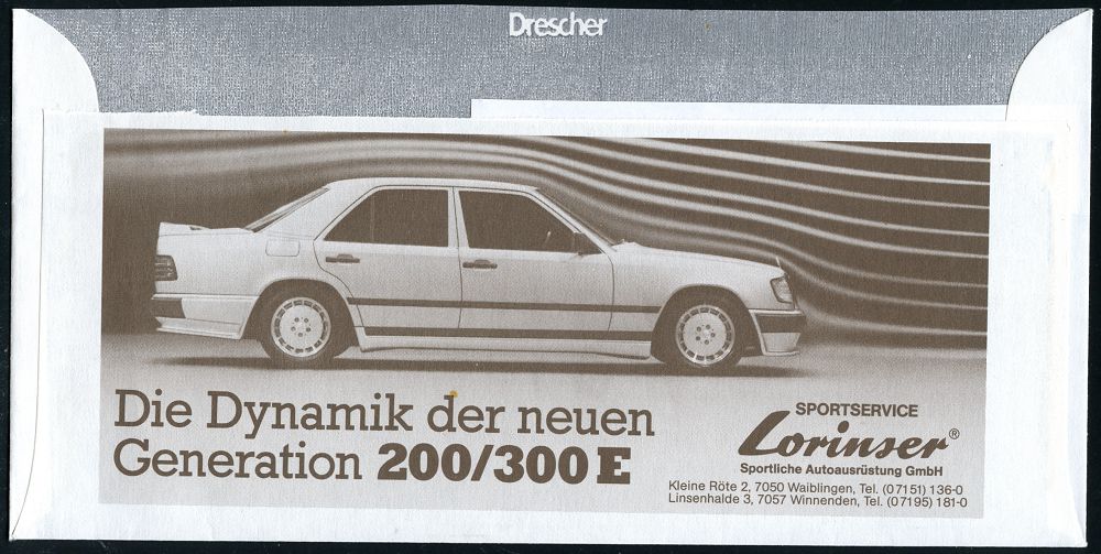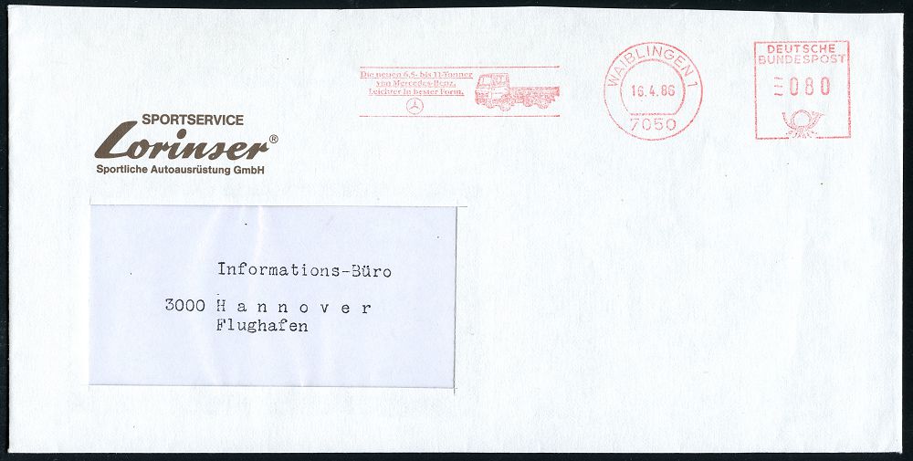 3926 | 6 € | POSTLEITRAUM 7000 (OHNE STUTTGART) : 7050 WAIBLINGEN 1/ Die neuen 6,5 bis 11 Tonner/ von Mercedes Benz 1986 (16.4.) AFS Pitney-Bowes (= Mercedes-LKW) Firmen-Bf.: SPORTSERVICE Lorinser... rs. Mercedes-Benz-Reklame MB 200/300 E (Dü.E-26E) | ![]() ![]() | |