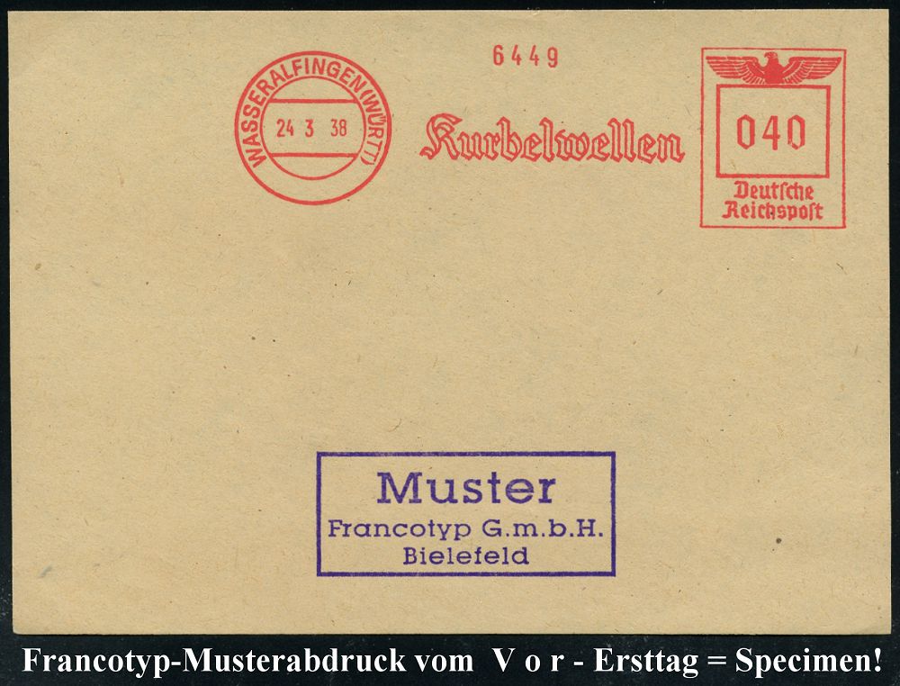 3928 | 35 € | POSTLEITRAUM 7000 (OHNE STUTTGART) : WASSERALFINGEN (WÜRTT)/ Kurbelwellen 1938 (24.3.) AFS-Musterabdruck Francotyp "Reichsadler" , glasklar gest. Francotyp-Musterblatt vom V o r - Ersttag! (mit Attest), selten! (Dü.E-5CGh) | ![]() ![]() | |