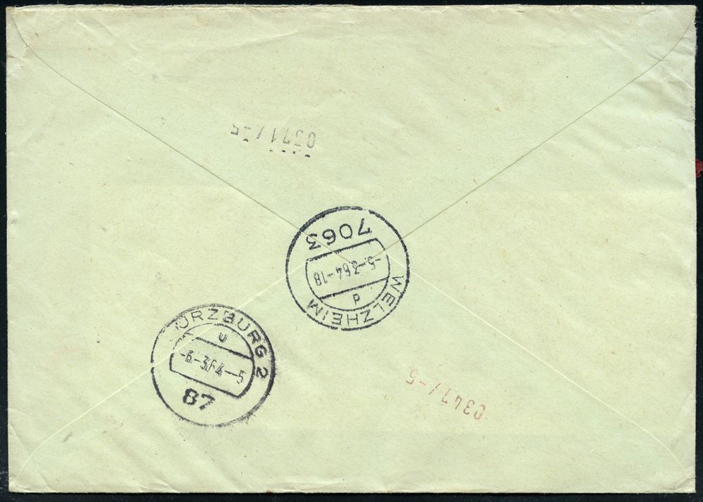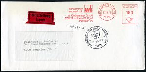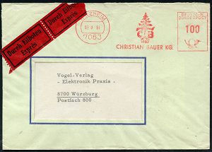 3930 | 15 € | POSTLEITRAUM 7000 (OHNE STUTTGART) : 7063 WELZHEIM/ CB/ CHRISTIAN BAUER KG 1964 (5.3.) AFS Francotyp 100 Pf. (Tanne) Fern-Eil-Bf. n. Würzburg, rs. AS. (Dü.E-23CO) | ![]() ![]() | |