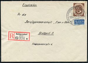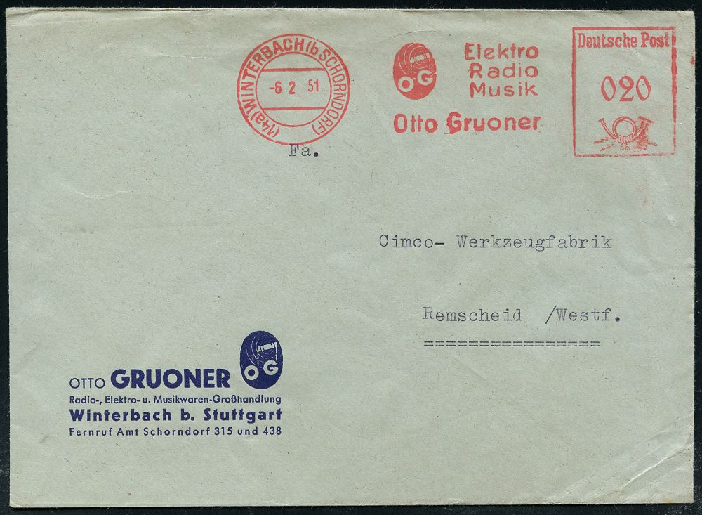 3934 | 15 € | POSTLEITRAUM 7000 (OHNE STUTTGART) : (14a) WINTERBACH (b SCHORNDORF)/ OG/ Elektro/ Radio/ Musik/ Otto Gruoner 1951 (6.2.) AFS Francotyp "Posthorn" (Monogr.-Logo mit Doppelnote) motivgl. Firmen-Bf. (Dü.E-20CEo) | ![]() | |