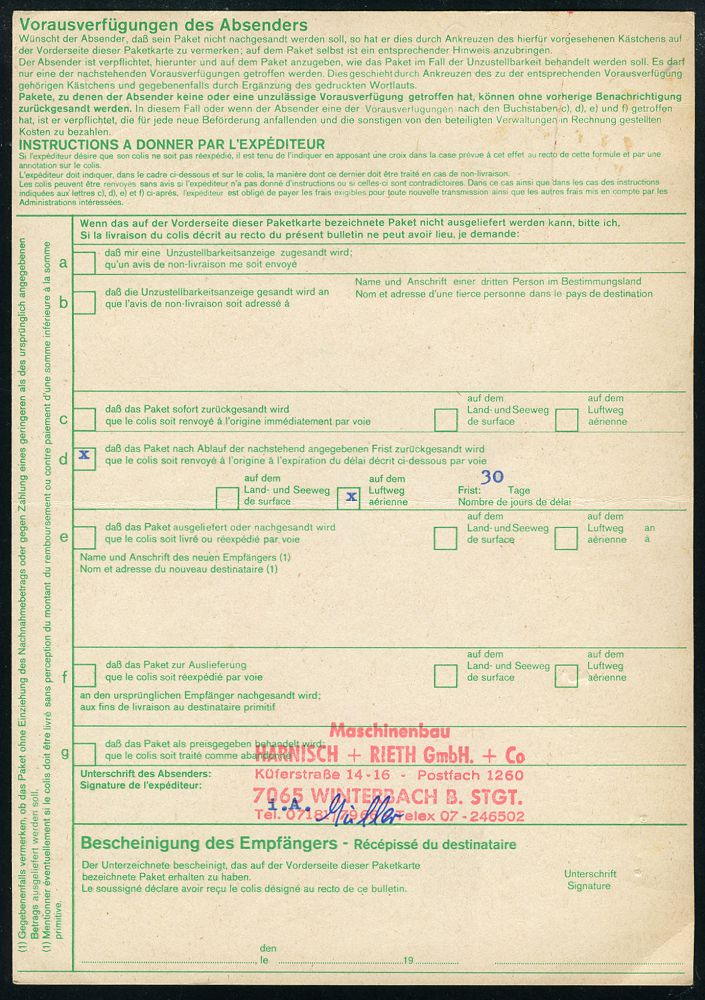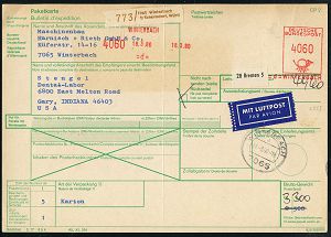 3935 | 25 € | POSTLEITRAUM 7000 (OHNE STUTTGART) : WINTERBACH =d= 1980 (18.3.) Paket-PFS Francotyp "Posthorn" 4060 Pf. (vierstellig) + brauner Paketzettel: 7065 Winterbach/ b Schorndorf, Württ klar gest. Übersee-Flp.-Paketkarte (schwache Mittelbugspur) n. USA, seltenes Porto! (Dü.H-6A vierstellig, Dürst unbekannt!) | ![]() ![]() | |
