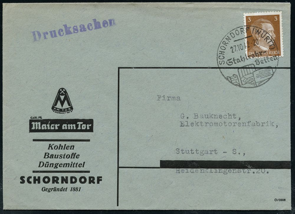 3865 | 15 € | POSTLEITRAUM 7000 (OHNE STUTTGART) : SCHORNDORF (WÜRTT)/ Stahlrohr-/ Betten 1942 (27.10.) HWSt (Stahlrohrbett/Nachttisch) auf dekorativem Firmen-Bf.: Maier am Tor, Kohlen, Baustoffe.. (Logo) Inl.-Drs.-Bf. (Bo.7 /Letztjahr) | ![]() | |