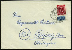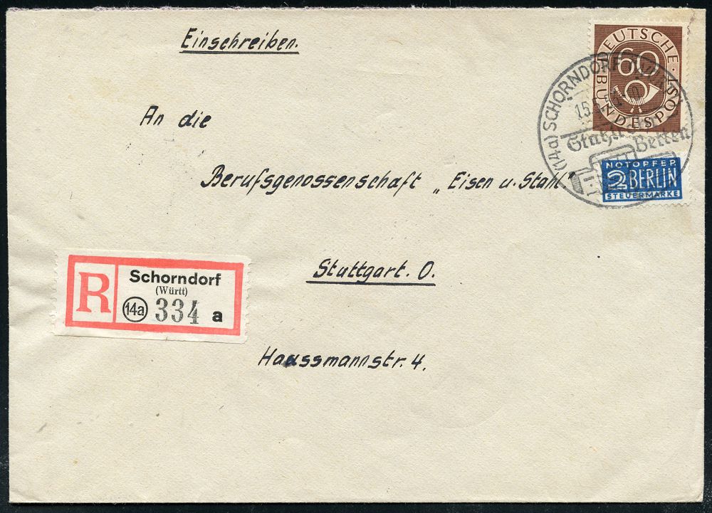 3866 | 15 € | POSTLEITRAUM 7000 (OHNE STUTTGART) : (14a) SCHORNDORF,WÜRTT/ Stahlrohr-/ Betten 1953 (15.5.) HWSt (Bett, Nachttisch) auf EF 60 Pf. Posthorn (Mi.135 EF, + 10.- EUR) + RZ: (14a) Schorndorf/(Württ)/a, klar gest. Fern-R-Bf. (Bo.10) | ![]() | |