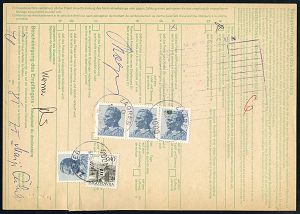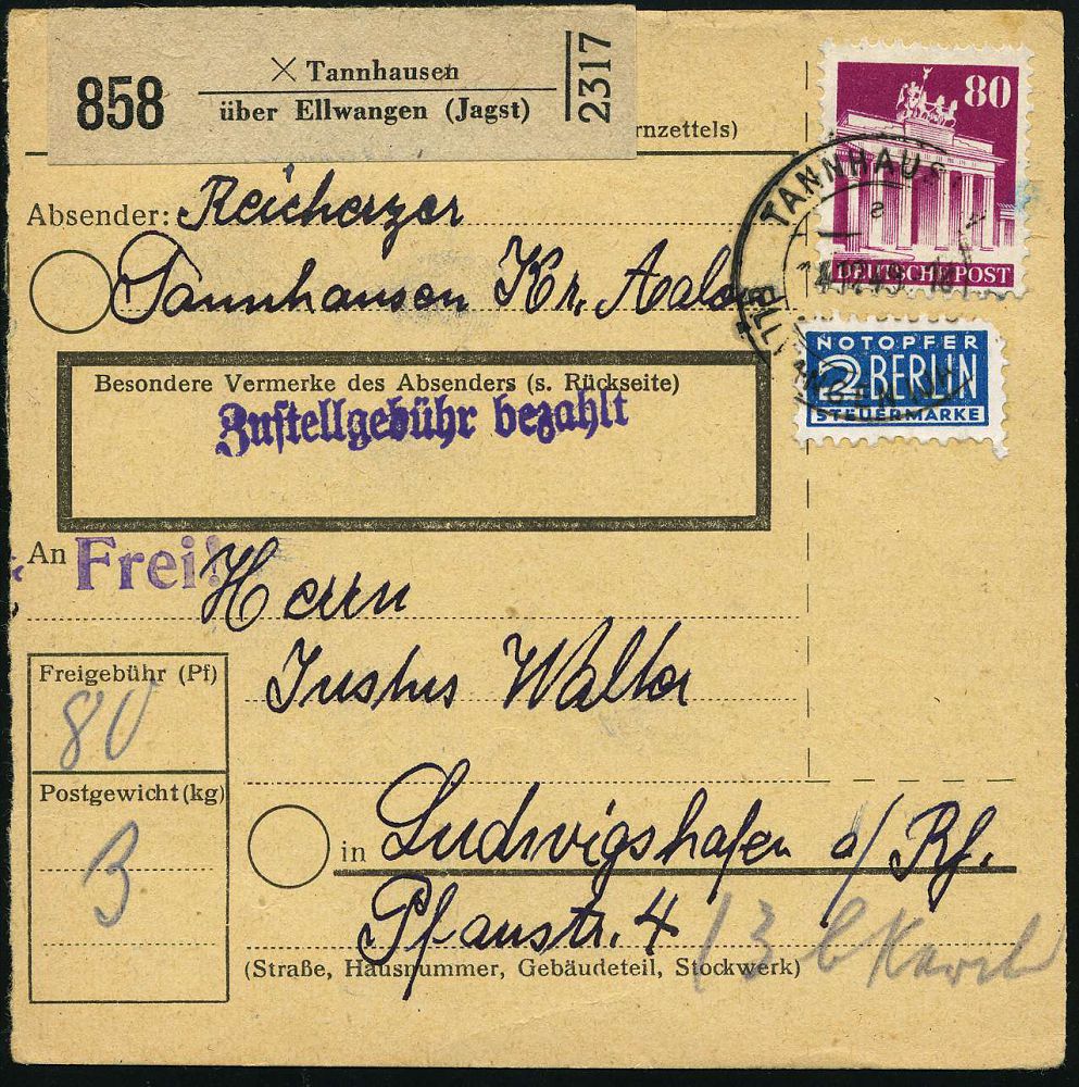 3905 | 15 € | POSTLEITRAUM 7000 (OHNE STUTTGART) : TANNHAUSEN/ a/ über/ ELLWANGEN (JAGST) 1949 (14.12.) 2K-Steg = PSt.I + 1L: Zustellgebühr bezahlt (rechts etw. undeutl.) EF 80 Pf. Brandenbg.Tor + Paketzettel: X Tannhausen/über Ellwangen (Jagst), Inl.-Paketkt.! (Mi.94 wg EF) | ![]() | |