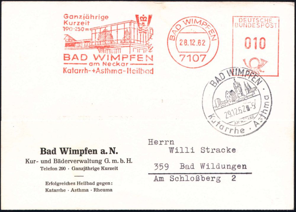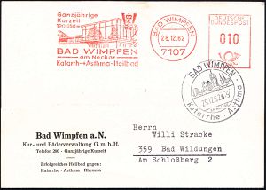 3759 | 16 € | POSTLEITRAUM 7000 (OHNE STUTTGART) : 7107 BAD WIMPFEN/ ..Katarrh+Asthma-Heilbad 1962 (28.12.) AFS (Kurhaus) + aptierter HWSt.: BAD WIMPFEN/Katarrhe - Asthma (= alte PLGZ entfernt!) v.29.12., da AFS-Datum falsch!, Kommunalkt., seltene Kombination! (Dü.E-26 + Bo.3 aptiert) | ![]() | |