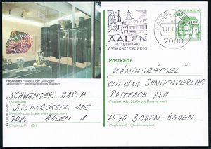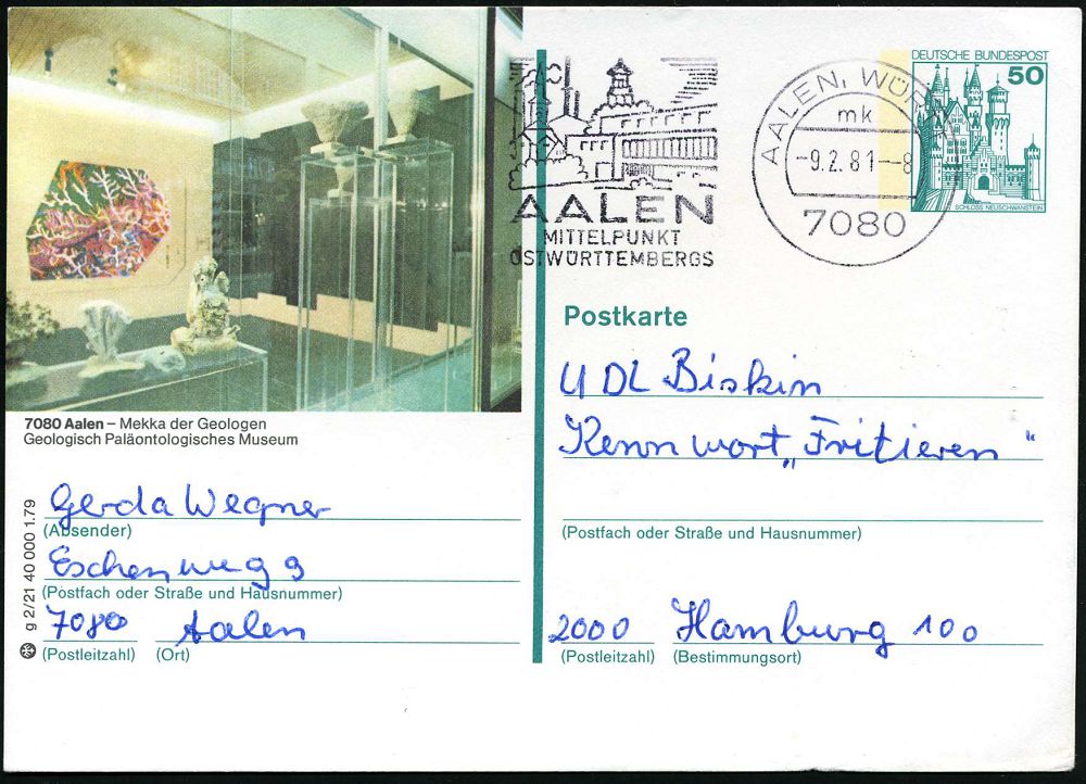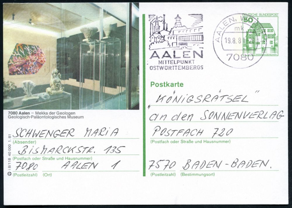 3756 | 12 € | POSTLEITRAUM 7000 (OHNE STUTTGART) : 7080 AALEN.WÜRTT/ mk/ MITTELPUNKT/ OSTWÜRTTEMBERGS 1981 (19.8.) MWSt auf ortsgleicher BiP 50 Pf.Burgen, grün: Mekka der Geologen, Geolog.-Paläontol. Museum , Bedarf!, seltene Kombination! (Mi.P 134/i- i8/118) | ![]() | |
