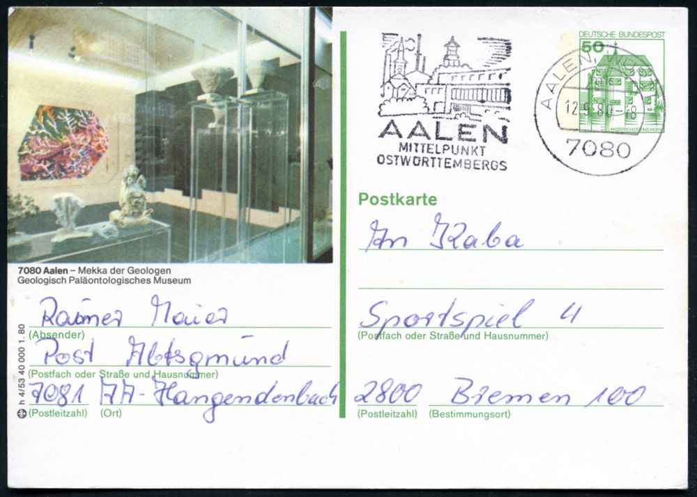 3755 | 12 € | POSTLEITRAUM 7000 (OHNE STUTTGART) : 7080 AALEN,WÜRTT/ mk/ MITTELPUNKT/ OSTWÜRTTEMBERG 1980 (12.9.) MWSt auf ortsgleicher 50 Pf. BiP Burgen, grün: Mekka der Geologen, Geolog. Paläontogisches Museum (Schauraum mit Versteinerungen)Bedarf!, seltene Kombination! (Mi.P 130/h 4/53) | ![]() | |