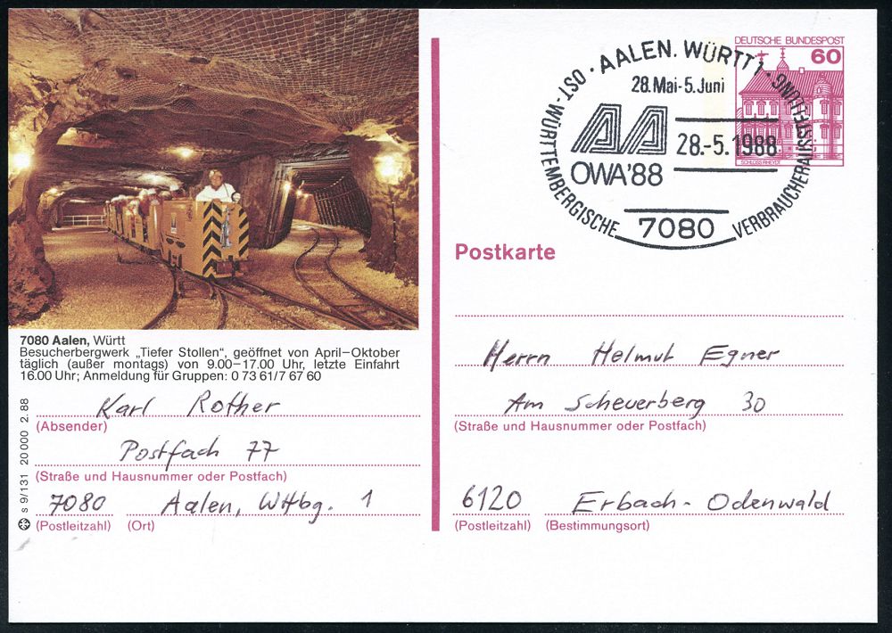3758 | 12 € | POSTLEITRAUM 7000 (OHNE STUTTGART) : 7080 AALEN.WÜRTT 1/ OWA´88/ OST-WÜRTTEMBERGISCHE VERBRAUCHERAUSSTELLUNG 1988 (28.5.) SSt auf ortsgleicher 60 Pf. BiP Burgen: 7080 Aalen..Besucherbergwerk "Tiefer Stollen".. (Grubenbahn) seltene Kombination (Mi.P 138) | ![]() | |
