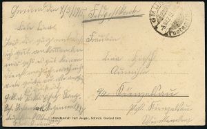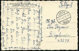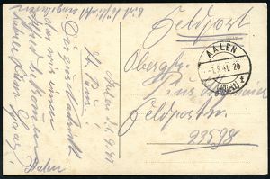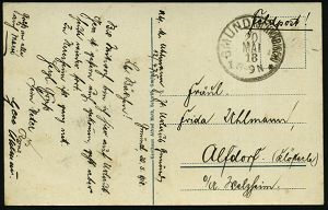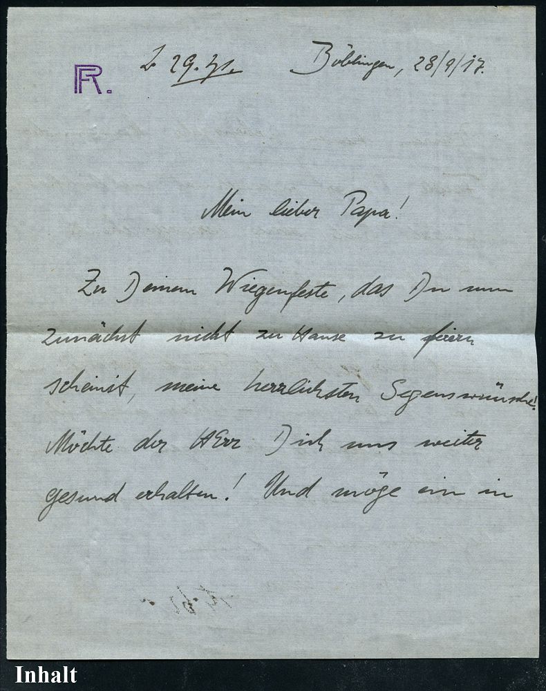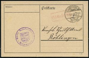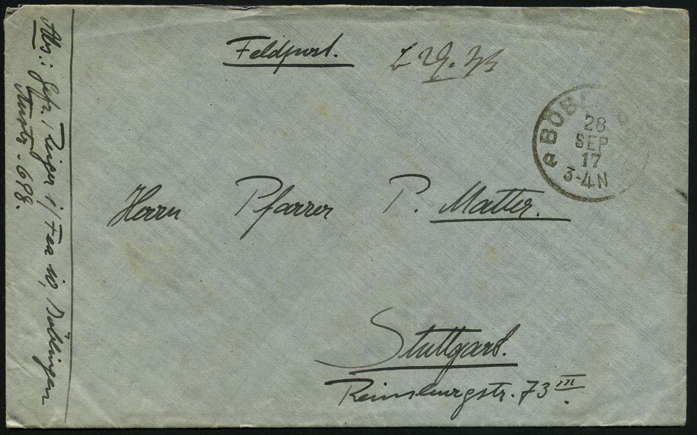 3761 | 20 € | POSTLEITRAUM 7000 (OHNE STUTTGART) : BÖBLINGEN 1917 (28.9.) 1K (nicht ganz voll) + hs. Abs.: "F e a 10 , Böblingen" = F eld-Flieger-Abtlg.. Feldpost-Bf. + Inhalt, Text über Urlaubssperre n. Stuttgart, 2 Belege kompl. (Kat.Nr.1211) | ![]() ![]() | |