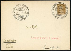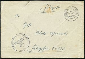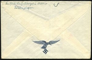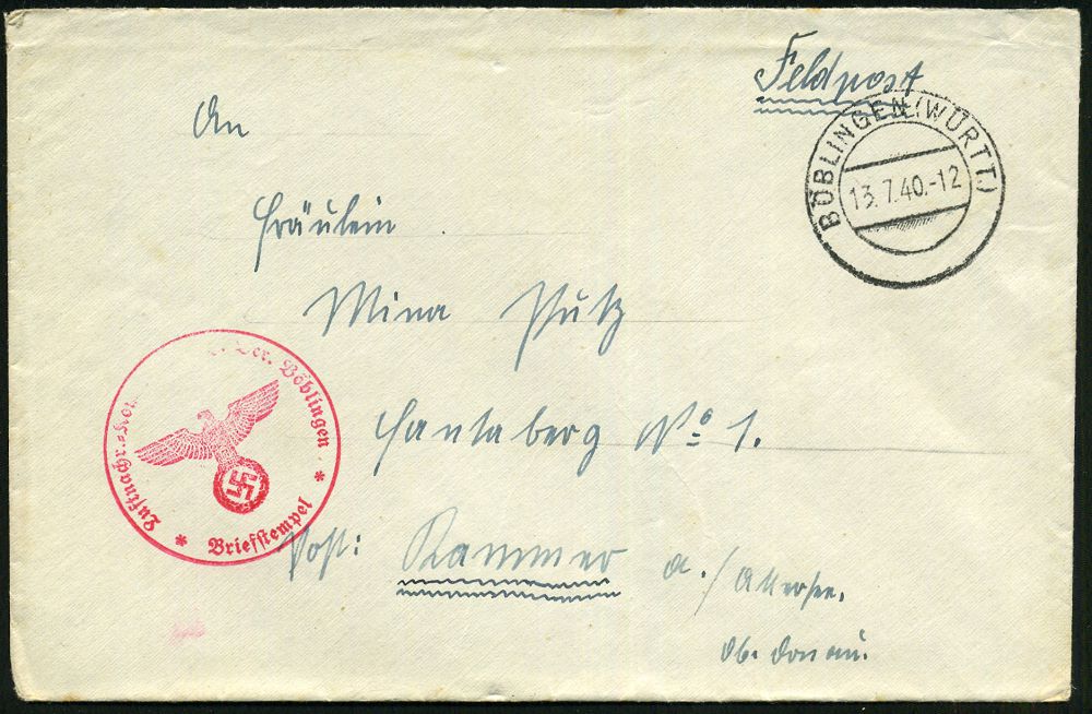 3764 | 20 € | POSTLEITRAUM 7000 (OHNE STUTTGART) : BÖBLINGEN (WÜRTT) 1940 (13.7.) 2K-Steg + roter 1K-HdN: Luftnachrichten-Komp. Flughafen Ber.(eich) Böblingen (oben etw. undeutl.) + rs. silberne Luftwaffen-Propaganda-Vignette Alder mit Hakenkreuz, Feldpost-Bf. n. Kammer/Attersee | ![]() ![]() | |