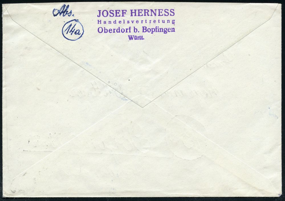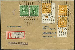 3882 | 18 € | POSTLEITRAUM 7000 (OHNE STUTTGART) : Schwäb.Gmünd 1946 (19.7.) Roll-WellenSt.: GMÜND/(SCHWÄBISCH) 2, 3x auf Kontrollrat Ziffer + RZ: Schwäbisch/Gmünd/b , klar gest. Firmen-R-Bf. n. Leipzig | ![]() | |