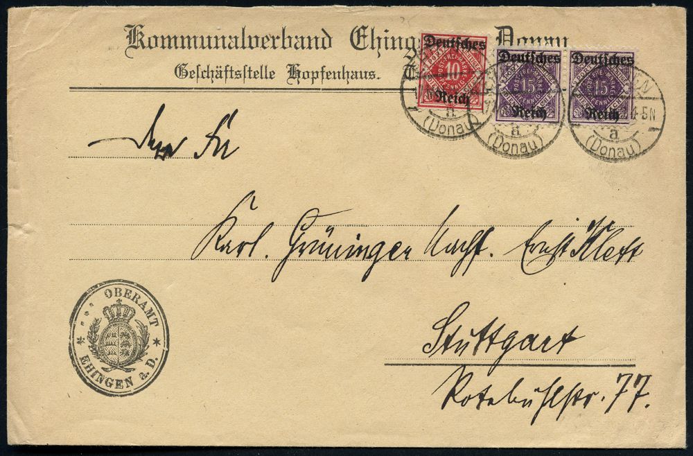 3775 | 18 € | POSTLEITRAUM 7000 (OHNE STUTTGART) : EHINGEN/ a/ (Donau) 1920 (17.5.) 1K-Brücke 3x auf Dienst-Bf.: Kommunalverband Ehingen/Geschäftsstelle Hopfenhaus , gedrucktes aptiertes. Sienstsiegel! (Kgl. entfernt) n. Stuttgart (Mi.D 53, 2x D 54,+ 12.-EUR) | ![]() | |