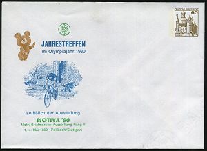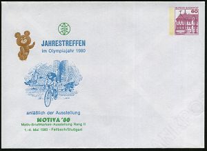 3802 | 10 € | POSTLEITRAUM 7000 (OHNE STUTTGART) : Fellbach 1980 PU 60 Pf. Burgen rotlila u. PU 60 Pf. braun: IMOS JAHRESTREFFEN im Olympiajahr.. Fellbach =je Olympia-Teddy, Rad-Rennfahrer, je ungebr. (Einzelverkauf möglich: je 6.- EUR) 2 Belege (Mi.PU 114, PU 115) | ![]() ![]() | |