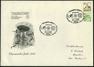 3804 | 18 € | POSTLEITRAUM 7000 (OHNE STUTTGART) : 7012 FELLBACH,WÜRTT 1/ JAHRESTREFFEN/ JMOS/ OLYMPIA U.SPORT.. 1980 (3.5.) SSt = Piktogr. Radsport (u.a.) 2x auf PU 30 Pf. + 50 Pf. Burgen: Olympisches Jahr 1980 = Eiskunstlauf, Hürdenläufer, Turmspringerin, Ski-Abfahrer = 2. Gew.-Stufe Briefdrucksache (Mi.PU 167/2) | ![]() | |