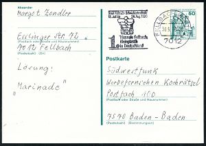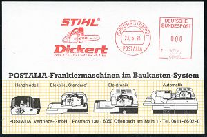 3925 | 15 € | POSTLEITRAUM 7000 (OHNE STUTTGART) : Waiblingen--Neustadt 1984 (23.5.) AFS.: VORFÜHRSTEMPEL/POSTALIA/STIHL/Dickert/MOTORGERÄTE (= Motorsäge) seltene Postalia-Muster-Kt. (= Specimen) | ![]() | |