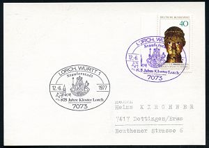 3838 | 16 € | POSTLEITRAUM 7000 (OHNE STUTTGART) : 7073 LORCH,WÜRTT 1/ Stauferstadt/ 875 Jahre Kloster Lorch 1977 (12.6.) violetter u n d schwarzer SSt = Kaiser Friedr. I, Barbarossa (u. Kloster) EF 40 Pf. Barbarossa-Reliquiar, Stauferjahr (Mi.933 EF) Inl.-Kt., seltene Kombination! (Bo.5 violett ! , nur 12.6.) | ![]() | |