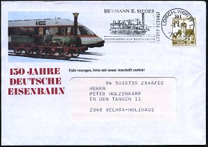 3840 | 8 € | POSTLEITRAUM 7000 (OHNE STUTTGART) : 7073 LORCH,WÜRTT 1/ 301/ GEBÜHR BEZAHLT/ H.E.SIEGER/ EISENBAHNEN AUF BRIEFMARKEN 1985 (3.4.) Freimarkenstempel = VE = histor. Dampflok "Adler" , motivgl. Jubil.-Reklame-Bf.: 150 Jahre Deutsche Eisenbahn | ![]() | |