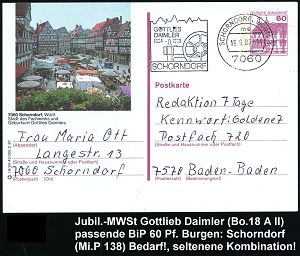 3872 | 14 € | POSTLEITRAUM 7000 (OHNE STUTTGART) : 7060 SCHORNDORF,WÜRTT 1/ me/ GOTTLIEB/ DAIMLER 1987 (19.6.) MWSt = Daimler-Motor auf themen- u. ortsgl. BiP 60 Pf. Burgen: Schorndorf/ Geburtsort..Daimlers , Bedarfs-Kt., seltene Kombination! (Mi.P 138) | ![]() | |