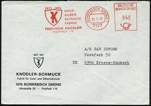 3883 | 10 € | POSTLEITRAUM 7000 (OHNE STUTTGART) : 707 SCHWÄBISCH GMÜND 1/ SEIT 1874/ GOLD-/ SILBER/ SCHMUCK/ FABTIK/ FRIEDR.KNÖDLER 1973 (23.1.) AFS Postalia (Monogr.-Logo) motivgl. Firmen-Bf. (Dü.E-26B) | ![]() | |
