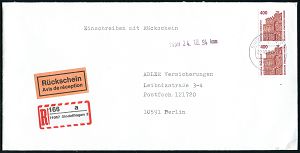 3899 | 12 € | POSTLEITRAUM 7000 (OHNE STUTTGART) : 71067 SINDELFINGEN 3/ a 1994 (22.10.) 1K a. Paar 400 Pf. Staatsoper Dresden + RZ: 71067 Sindelfingen 3/a (neue PLZ, Selbstklebezettel) Inl.-R-Bf. "Rückschein" (Mi1562 MeF, + 10.- EUR) | ![]() | |