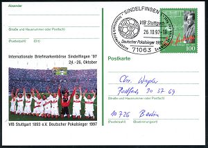3901 | 6 € | POSTLEITRAUM 7000 (OHNE STUTTGART) : 71063 SINDELFINGEN 1/ VfB Stuttgart/ Deutscher Pokalsieger.. 1997 (26.10.) SSt = Fußball auf passender Sonder-P 100 Pf. Sepp Herberger/ VfB-Stuttgart 1893 (Mi.PSo.50) | ![]() | |