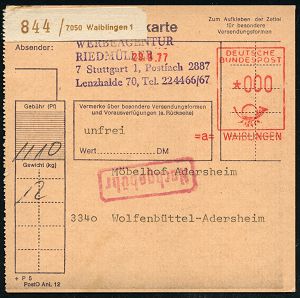3922 | 12 € | POSTLEITRAUM 7000 (OHNE STUTTGART) : =a= WAIBLINGEN 1977 (29.8.) Maschinen-Paket-FS Francotyp "Posthorn" *000 Pf. + roter Ra.: Nachgebühr + brauner Paketzettel: 7050 Waiblingen 1 klar gest., unfreie Inl.-Paketkt. (Dü.H-6C) | ![]() | |