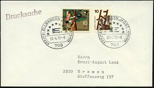 3780 | 8 € | POSTLEITRAUM 7000 (OHNE STUTTGART) : 709 ELLWANGEN,JAGST/ Europa Marsch 1972 (22.4.) SSt (gr. "E" u. Sterne) klar gest. Inl.-Bf. (Bo.9 , IV. Verwendung!) | ![]() | |