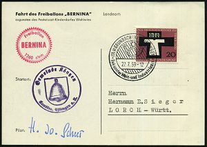 3809 | 15 € | POSTLEITRAUM 7000 (OHNE STUTTGART) : (14a) GRUNBACH (Kr WAIBLINGEN)/ ..Wein-u.Industrieort 1959 (27.7.) HWSt + viol. HdN: Geiemde Köngen.. + roter HdN: Freiballon/BERNINA.. , klar gest. Pestalozzi-Kinderdorf-Ballon-Sonderkt. (Bo.1) | ![]() ![]() | |