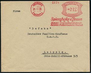 3811 | 20 € | POSTLEITRAUM 7000 (OHNE STUTTGART) : HEUBACH/ (WÜRTT.)/ Spiesshofer & Braun/ GmbH/ Betrieb I Corsettenfabrik/ Betrieb II Frottierweberei 1933 (21.11.) AFS Francotyp "Bogenrechteck" , klar gest, Fern-Bf. (Dü.E-1Ah) | ![]() ![]() | |