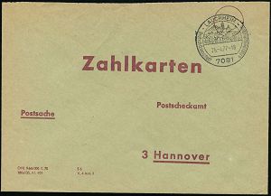 3819 | 22 € | POSTLEITRAUM 7000 (OHNE STUTTGART) : KORNWESTHEIM/ Stotz 1946 (1.10.) AFS Francotyp "Bogenrechteck" unverändert weiterverwendet! = Notmaßnahme! (= Eisengießerei u. Maschinenfabrik) + Abs.-4L: Derzeitige Postanschrift/..(14 a) Kornwestheim (noch kriegsbedingt ausgelagert!), Inl.-Bf. (Dü.E-1BAh unverändert) | ![]() | |