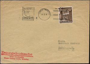3833 | 35 € | POSTLEITRAUM 7000 (OHNE STUTTGART) : LORCH (WÜRTT)/ =459=/ HERMANN/ SIEGER/ LORCH-WTTB 1941 (12.2.) Freimarkenstempel (= Franierautomat u.Vorausentwertung) auf EF 3 + 2 Pf. WHW (Danzig Artushof) + roter 3L: Zeitungsdrucksache.., Bedarfs-Vorderseite., seltene Zuschlags-VE-Frankatur! (Mi.751 EF) | ![]() | |