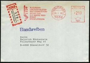 3892 | 18 € | POSTLEITRAUM 7000 (OHNE STUTTGART) : 7032 SINDELFINGEN 1/ XI.EUROPA-/ LEICHTATHLETIK-/ MEISTER-/ SCHAFTEN/ 1.+ 2.MÄRZ/ STADT/ SINDEL-FINGEN 1980 (29.1.) AFS Francotyp 210 Pf. (Monogr.-Logo) + RZ: 7032 Sindelfingen 1/f, Inl.-R-Bf. (Dü.E-26, nur kurze Verwendungszeit) | ![]() | |