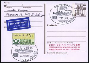 3893 | 8 € | POSTLEITRAUM 7000 (OHNE STUTTGART) : 7032 SINDELFINGEN 1/ TAG DER / BRIEFMARKE 1985 (27.10.) SSt. (Raddampfer) auf Inl.-P 40 Pf. + ATM 25 Pf., portorichtige Inl.-Flp.-Karte | ![]() | |