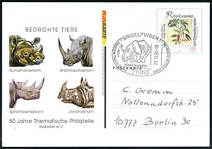 3902 | 6 € | POSTLEITRAUM 7000 (OHNE STUTTGART) : 71063 SINDELFINGEN 1/ Indisches Panzernashorn.. 2001 (28.10.) SSt = Panzernashorn auf motivähnl. Sonder-P 100 Pf. Pluskarte : BEDROHTE TIERE (Sumatra-, Breitmaul-, Spitzmaul- u.Javanashorn) Inl.-Karte (Mi.PSo 77 II) | ![]() | |