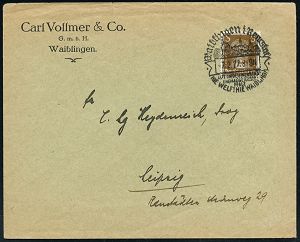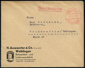 3911 | 14 € | POSTLEITRAUM 7000 (OHNE STUTTGART) : WAIBLINGEN/ 3 RPf./ Gebühr bezahlt 1932 (12.9.) 1K-Brücken PFS auf Firmen-Reklame-Bf.: H. Auwaerter & Co... Reiseartikel- u. Lederwarenfabrik (Schrankkoffer) Inl.-Drs.-Bf. (Dü.A-6, Nr.25) | ![]() | |