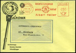 3920 | 16 € | POSTLEITRAUM 7000 (OHNE STUTTGART) : 705 WAIBLINGEN 1/ Roller´s Erzeugnisse/ ..Albert Roller 1964 (19.6.) AFS Francotyp "Posthorn" klar auf Reklame-Bf.: ALROWA.. (In- u. Auslandspatente) , rs. dekorative weitere Reklame mit techn. Geräten (Dü.E-23CE) | ![]() ![]() | |