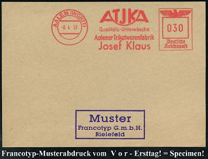 3740 | 35 € | POSTLEITRAUM 7000 (OHNE STUTTGART) : AALEN (WÜRTT)/ ATJKA/ Qualitäts-Unterwäsche/ Aalener Trikotwarenfabrik/ Josef Klaus 1937 (6.4.) AFS-Musterabdruck Francotyp "Reochsadler" , glasklar gest. Francotyp-Musterblatt vom V o r - Ersttag! mit Attest, selten! (Dü.E-5CGo) | ![]() ![]() | |