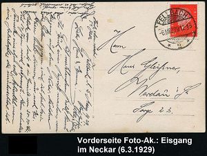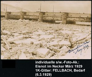3790 | 20 € | POSTLEITRAUM 7000 (OHNE STUTTGART) : FELLBACH/ *2* 1929 (6.3.) 1K-Gitter-Brücke auf EF 10 Pf. Ebert, rot , Foto-Ak. "Eisnot im Neckar März 1929" (hs. Zusatz) mit entspr. Text über den Eisgang auf dem Neckar (Mi.413 EF + 18.- EUR) | ![]() ![]() | |