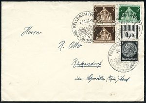 3791 | 16 € | POSTLEITRAUM 7000 (OHNE STUTTGART) : FELLBACH (WÜRTT)/ Wein-u.Gartenbau 1936 (26.7.) HWSt (Blumen, Weintraube) 3x auf Paar 3 Pf. u. 5 Pf. "Internat. Bevölkerungskongreß" (Mi.617 (2), 618 etc.) portorichtiger Fern-Bf. (Bo.1) | ![]() | |
