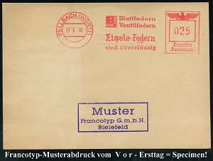 3793 | 35 € | POSTLEITRAUM 7000 (OHNE STUTTGART) : FELLBACH (WÜRTT)/ Blattfedern/ Ventilfedern/ Eisele-Federn.. 1938 (17.3.) AFS-Musterabdruck Francotyp "Reichsadler" , glasklar gest. Francotyp-Musterblatt vom V o r - Ersttag! (mit Attest), selten! (Dü.E-5CGo) | ![]() ![]() | |
