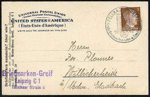 3795 | 18 € | POSTLEITRAUM 7000 (OHNE STUTTGART) : FELLBACH (WÜRTT)/ Gr.Briefmarken-Lehr-u.Sonderschau 1942 (19.2.) SSt (Stadtwappen) auf Color-Litho-Reklame-Ak. der Fa. Greif , Leipzig mit US-Dauerserien (Bo.3) | ![]() ![]() | |