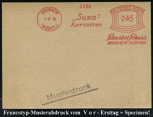3810 | 35 € | POSTLEITRAUM 7000 (OHNE STUTTGART) : HEUBACH/ (WÜRTT.)/ "Susa"-Korsetten/ Schneider & Sohn AG.. 1930 (1.10.) AFS-Musterabdruck Francotyp "Bogenrechteck" , glasklar gest. Francotyp-Musterblatt vom V o r - Ersttag! (mit Atttet) selten!, vergl. Kat.-Nr.3012 (Dü.E-1CEh) | ![]() | |