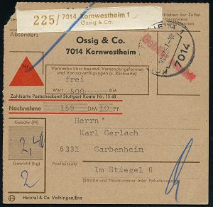 3821 | 12 € | POSTLEITRAUM 7000 (OHNE STUTTGART) : 7014 KORNWESTHEIM 1/ a 1967 (12.12.) 1K + brauner Selbstbucher-Paketzettel: 7014 Kornwestheim 1/ Ossig & Co. auf Inl.-NN-Paketkarte (kl. Ecke fehlt) + roter 1L: Gebühr bezahlt | ![]() | |
