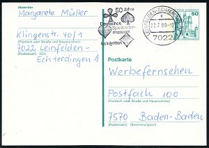 3831 | 5 € | POSTLEITRAUM 7000 (OHNE STUTTGART) : 7022 LEINFELDEN-ECHTERDINGEN 1/ e/ 50 Jahre/ Deutsches/ Spielkarten.. 1980 (22.2.) MWSt (französ Spielkartensymbole) Bedarfs-Kt. (Bo.5 A II) | ![]() | |