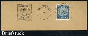 3832 | 16 € | POSTLEITRAUM 7000 (OHNE STUTTGART) : LORCH (WÜRTT)/ =459=/ HERMANN/ SIEGER.. 1938 (23.11.) Freimarkenstempel = Vorausentwertung auf 4 Pf. Hindenburg , klar gest. Briefstück = Frankierautomat Fa. "Telefonbau & Normalzeit" ! (Mi.514) | ![]() | |