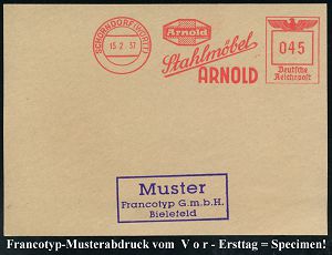 3858 | 35 € | POSTLEITRAUM 7000 (OHNE STUTTGART) : SCHORNDORF (WÜRTT)/ Stahlmöbel/ ARNOLD 1937 (15.2.) AFS-Musterabdruck Francotyp "Reichsadler" (Firmen-Logo) glasklar gest. Francotyp-Musterblatt vom V o r - Ersttag! (mit Attest), selten! (Dü.E-5CGo) | ![]() ![]() | |